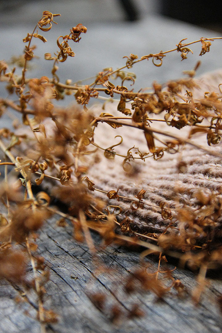 A hand-knitted hat in terracotta colour. The yarn is hand-dyed with willow leaves. Made from raw Slovenian wool
